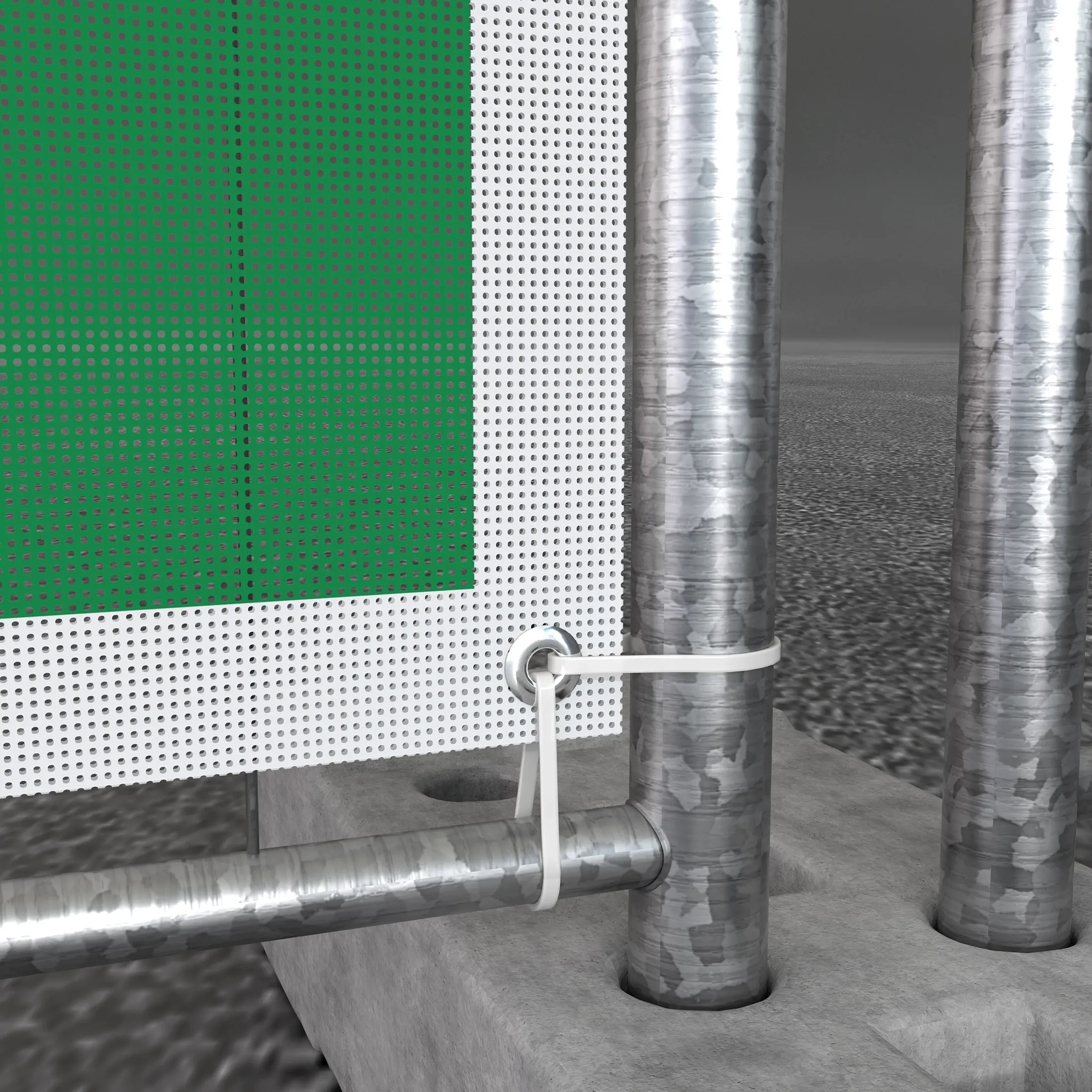 Wichtiger Hinweis: Der Bauzaun sowie die Kabelbinder sind nicht im Lieferumfang enthalten. Das Banner wird zur Befestigung an bestehenden Bauzäunen geliefert.